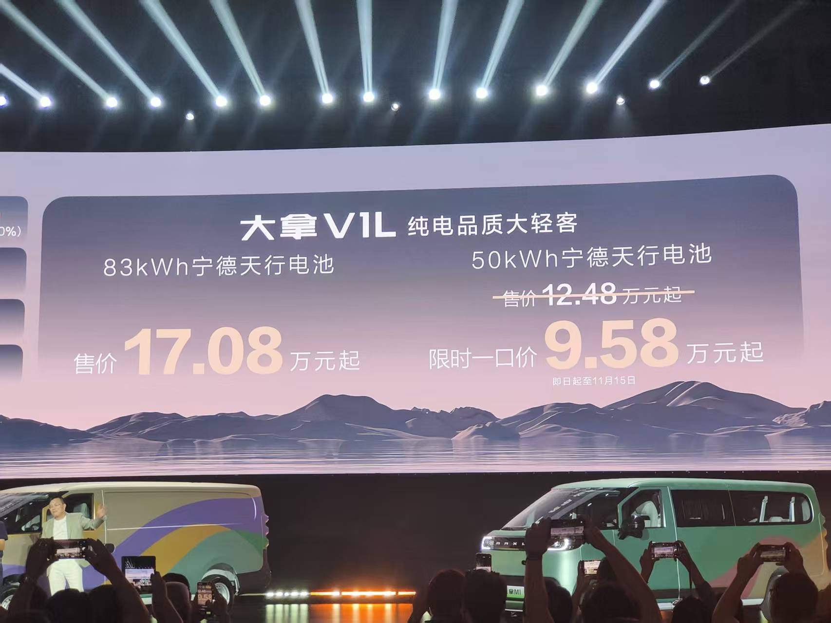 纯电大轻客大拿V1L,定位客货运与定制场景,83度宁德天行电池版价格17.08万元起;50度宁德天行电池版价格12.48万元起,在发布会上还推出限时一口价,本日起至11月15日前购车,价格9.58万元起。大拿M1,定位轻客营运车,搭载83度宁德天行电池,价格19.78万元起。