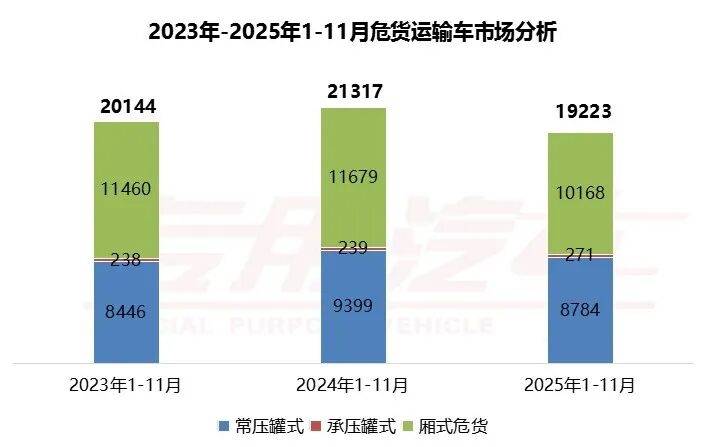 从整体规模来看,危货运输车市场体量近几年从始至终维持在2万台左右的水平,需求相对来说比较稳定。2025年1-11月,全国危货运输车累计销量19223台,较 2024年同期的21317台同比下降9.8%。细分结构上,厢式危货运输车1-11月销量达10168台,占据半壁江山;常压罐式车辆需求稳健,销量8784台;承压罐式车辆销量271台。